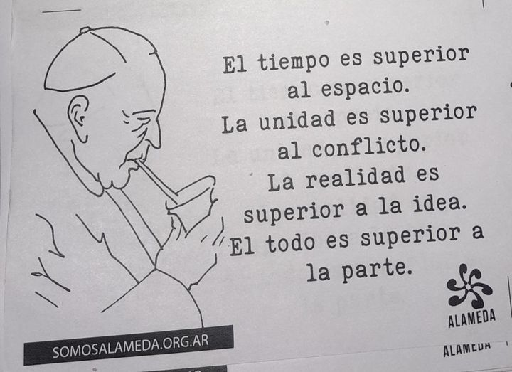 Además, nos reveló que vivimos una tercera guerra mundial en cuotas por el reparto de los mercados entre los poderosos, un estrangulamiento de los países del sur —saqueados y endeudados por los del norte— y un predominio del capital financiero parasitario sobre el productivo. Ante este panorama, nos convoca a luchar juntos por sociedades que sean justas en su distribución, inclusivas para que en ellas quepamos todos y sustentables en su armonía con la naturaleza. Para ello, nos propuso recorrer el camino de la fraternidad humana, uniendo a todos los buenos corazones samaritanos en pos de reconstruir comunidades con centro en los seres humanos, pregonar por la paz, reemplazar la emisión de carbono por energías renovables y no dejar a nadie herido al costado del camino. Su llamado fue una lucha por los derechos básicos: tierra, techo y trabajo.